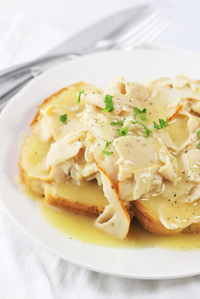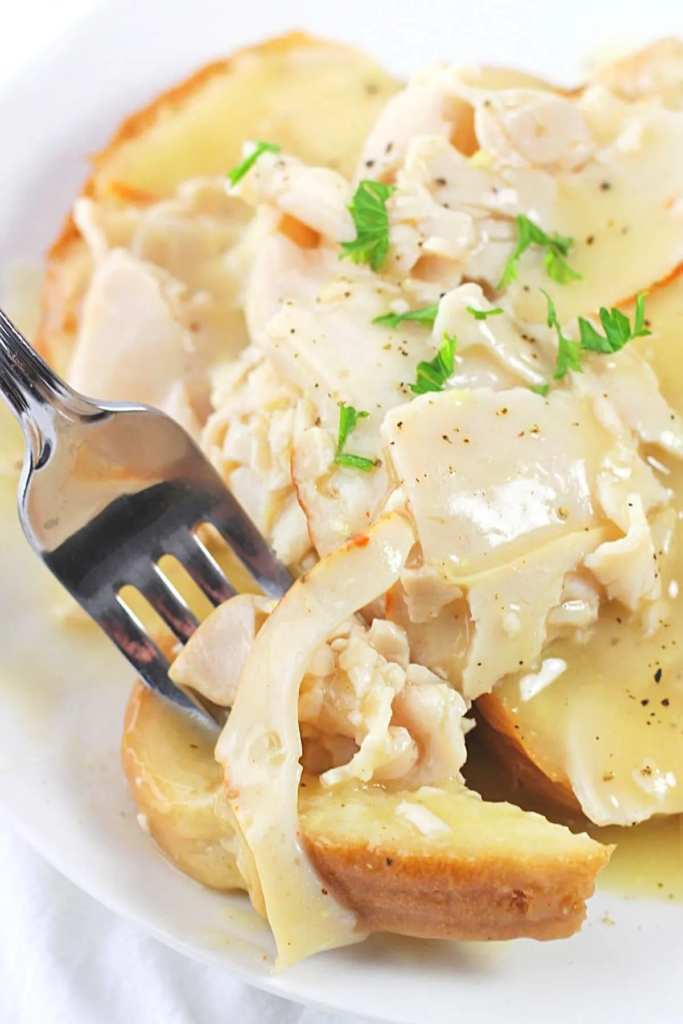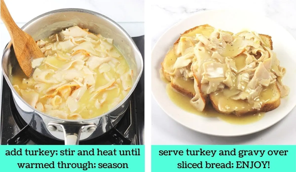 For each serving, place 2 slices of bread on a plate and top with one-fourth of the turkey and gravy (there should be plenty of gravy to top some fries or mashed potatoes if you are serving them). Sprinkle with chopped fresh parsley, if desired.