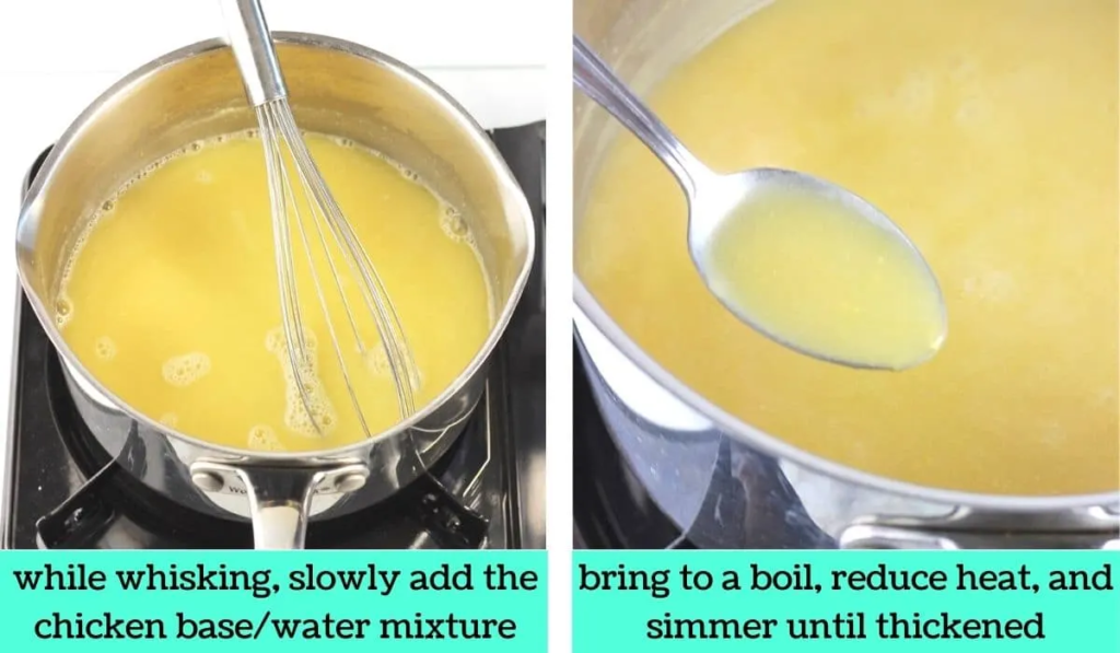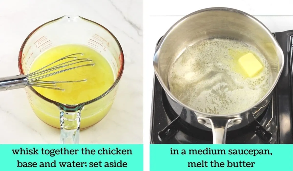 In a large measuring cup or a bowl, whisk together the roasted chicken base and water until well-combined; set aside.