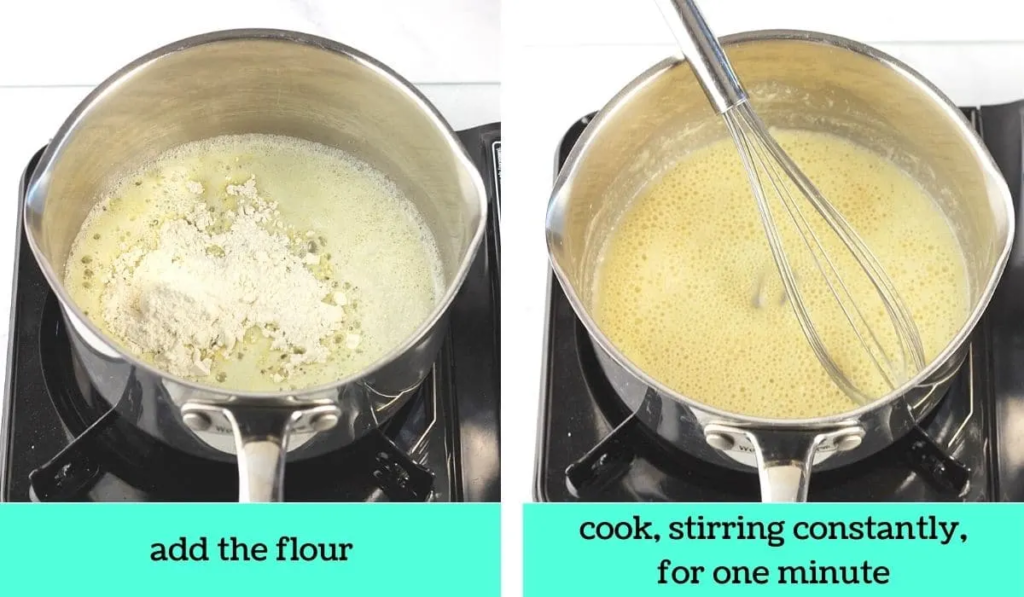 When the butter has completely melted, add the flour. Whisk to combine and cook, stirring constantly, for one minute (this will cook out the raw flour taste).