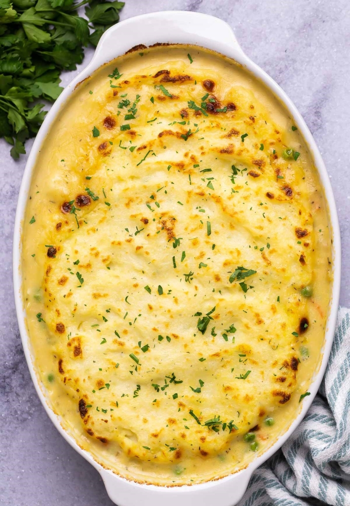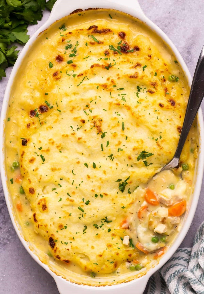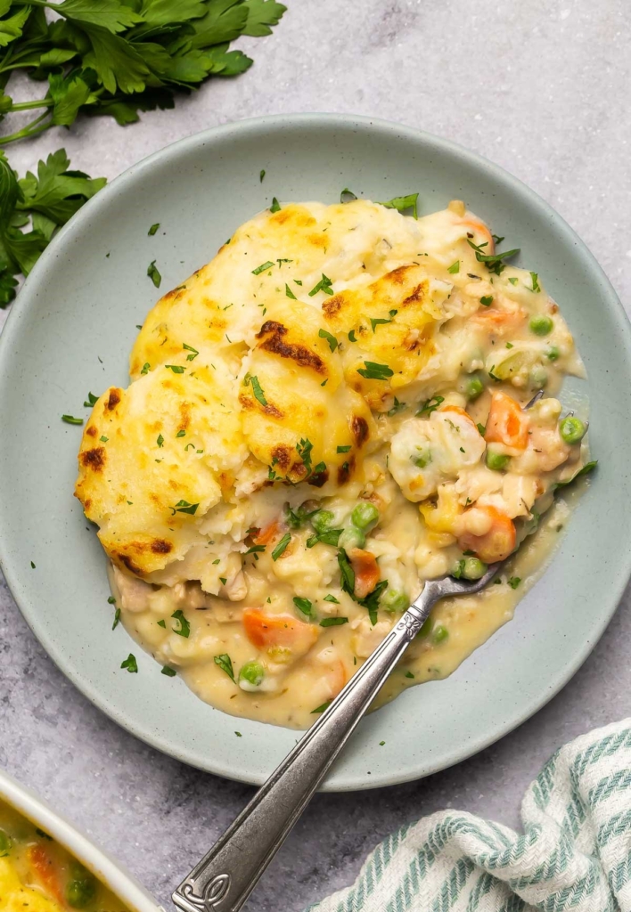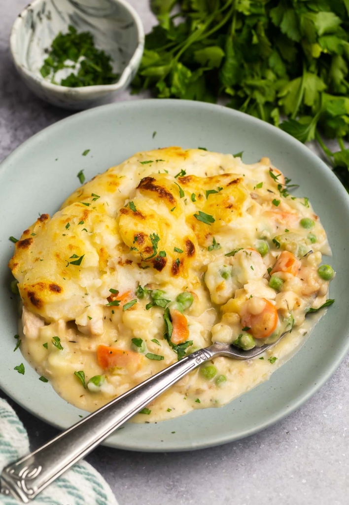 This Creamy Turkey Shepherd’s Pie is the best way to use up all your holiday dinner leftovers. It’s loaded with turkey and veggies, then topped with mashed potatoes. The perfect comfort food! You know what I love? Leftovers. Leftover soup, leftover pizza, leftover pasta…I just can’t get enough. But I think we can all agree that the best day for leftovers is the day after Christmas. And one of my favorite past times is dreaming up ways to use them. Obviously this Turkey Shepherd’s Pie was at the top of the list (along with this Turkey Tetrazzini and this Turkey Noodle Soup). I mean, it’s kind of brilliant right? Toss in pretty much everything you’ve got from your holiday dinner (turkey, gravy, veggies, potatoes), then throw it in the oven to warm it up and your delicious dinner is ready to go. The perfect comfort food!