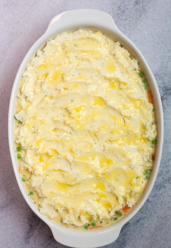 Top with mashed potatoes and dab with remaining butter or brush with 1 tbsp canola oil. Bake for 20 minutes, or until potatoes are heated through.