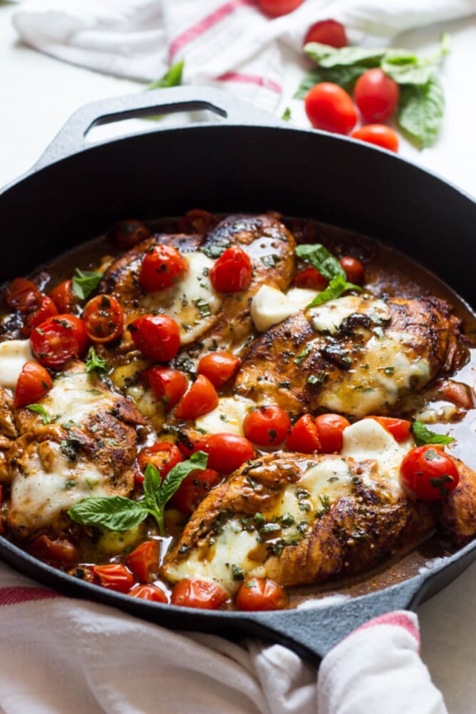 Juicy one-pan balsamic chicken topped with fresh tomatoes, mozzarella, and basil. This easy dinner comes together so easily and will surely become a family favorite!
