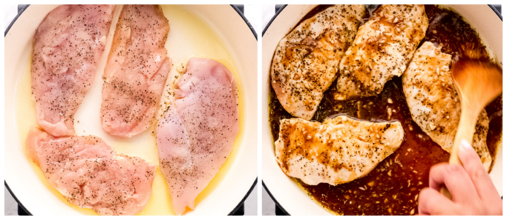 Heat oil over medium-high heat in a large oven-safe skillet. Season the chicken all over with salt and pepper, to taste. When the pan is hot and oil is shimmering, add the chicken to the skillet in a single layer. Cook for 1-2 minutes on each side or until lightly golden brown. Add the balsamic sauce mixture. It should quickly come to a simmer. Use a wooden spoon to scrape up any brown bits from the bottom of the pan.