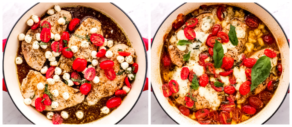 Immediately remove the pan from the heat and add the tomato mozzarella mixture over the chicken.