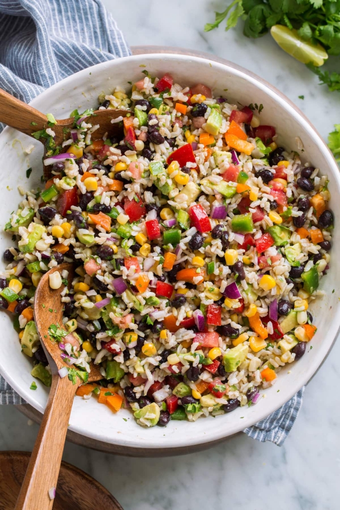 A perfectly delicious and healthy rice recipe! This Fiesta Rice is packed with nutritious goodness and incredibly hearty. It’s made up of brown rice, black beans, tons of fresh colorful vegetables and it’s all tossed with a bright cilantro lime dressing. You’ll love it! I love to serve it with grilled chicken or pan seared salmon, and it would also be delicious with shrimp. Honestly though it’s so filling that you could just serve up a bowlful of this for lunch or dinner and no one would be complaining. We all get caught in the slump of “what am I going to make to go with it”? This seems like a good all-purpose place to go, no more boring plain rice! And it’s made with simple ingredients yet it’s brimming with flavor! Fresh ingredients make the best recipes! It’s just one of those recipes that you can feel great about eating, possibly even giving you a little pep in your step instead of feeling weigh down after dinner. This is fuel you through the day food.
