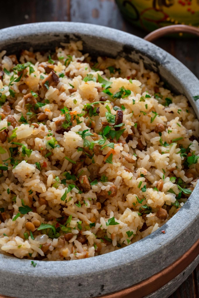 If using leftover (already cooked) rice, just add the rice at step 3 and skip the water and chicken bouillon. Let it cook briefly, to warm, and then stir the lentils and parsley.