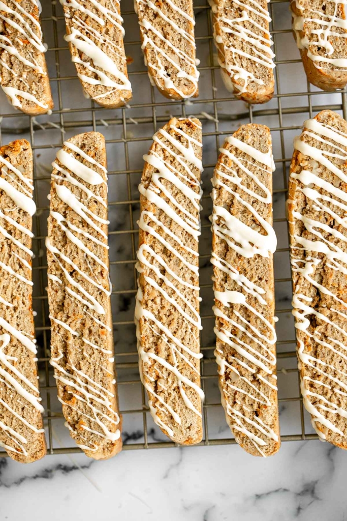Allow biscotti to cool in the baking sheet for 5 minutes, then transfer to a wire cooling rack to cool down completely before serving or drizzling with chocolate.