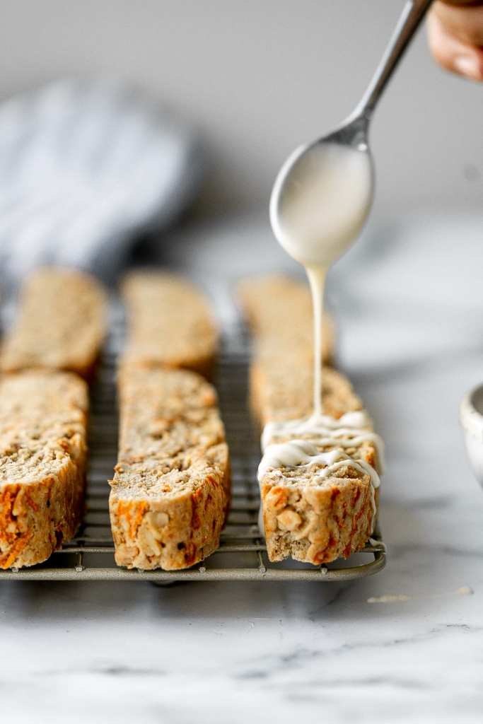 Carrot cake biscotti is crunchy, crumbly, and satisfies all your carrot cake cravings. Carrots and walnuts add that extra bit of seasonal flavor in these Italian cookies, making them a total crowd favorite whenever I bake them during the spring, or any time of year really. You can enjoy them as is, or with a drizzle of white chocolate on top for that extra bit of sweetness and flavor. So make up a pot of hot coffee or hot chocolate, because carrot cake biscotti are the ultimate cookie made for dunking. Carrot cake biscotti is crunchy, crumbly, and satisfies all your carrot cake cravings. Enjoy these Italian cookies as is or with white chocolate.