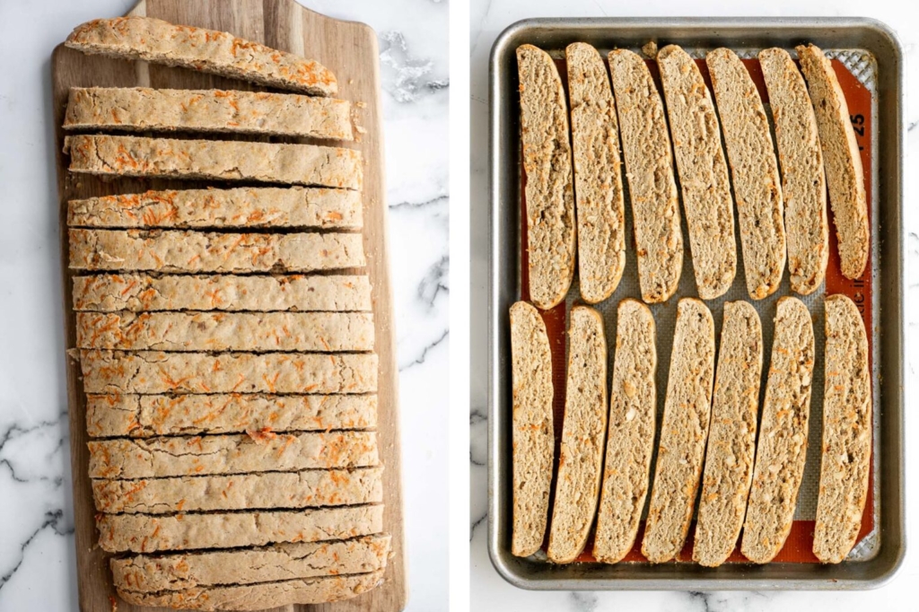 Reduce the oven temperature to 300F. Place the biscotti back on the lined baking tray (standing up on its cut side) and bake for 12 minutes. Then remove from oven and flip the biscotti over to the other side. Bake for another 10-12 minutes until crisp and golden.