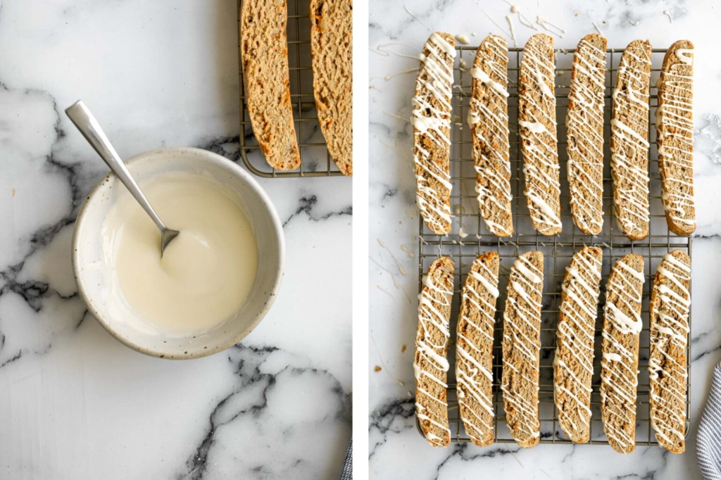 Once the cookies have cooled, use a small spoon and drizzle the melted chocolate over the cooled biscotti. Allow the chocolate to harden and set before stacking and storing.