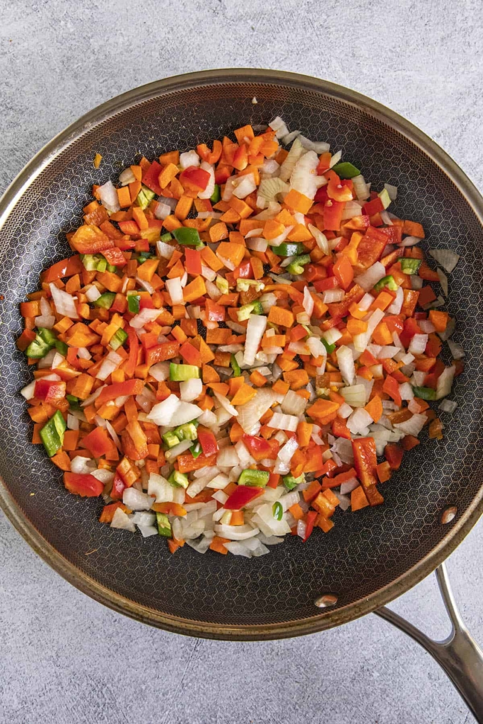 Add the onion, peppers and carrots, and cook for 5 minutes to soften.