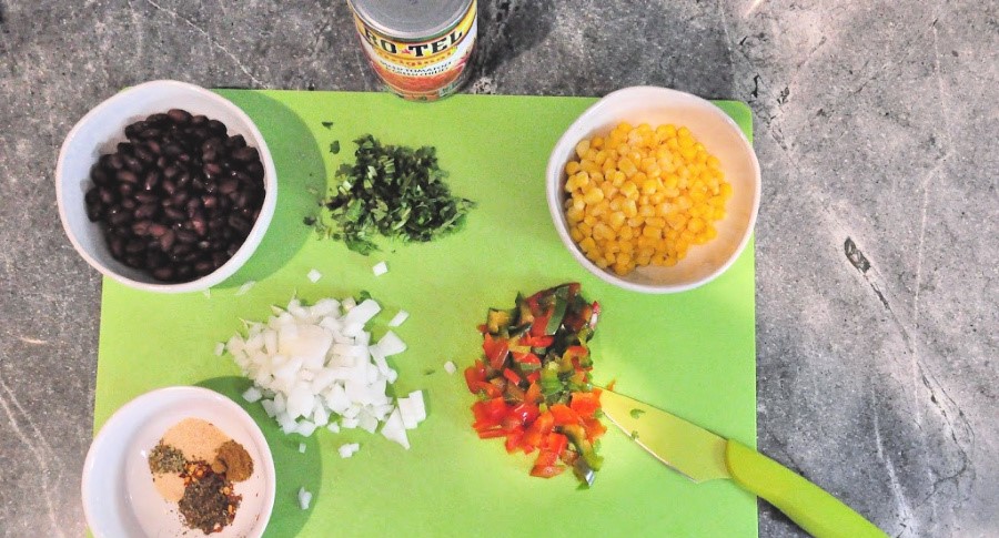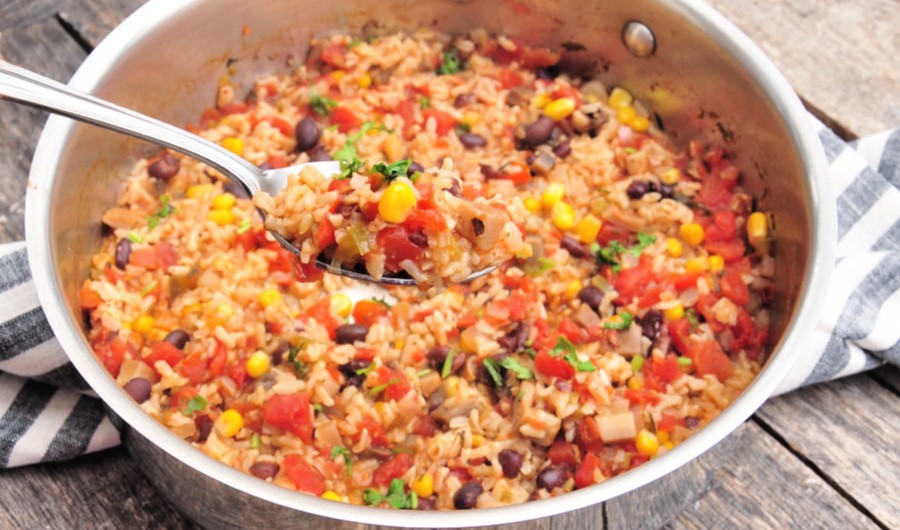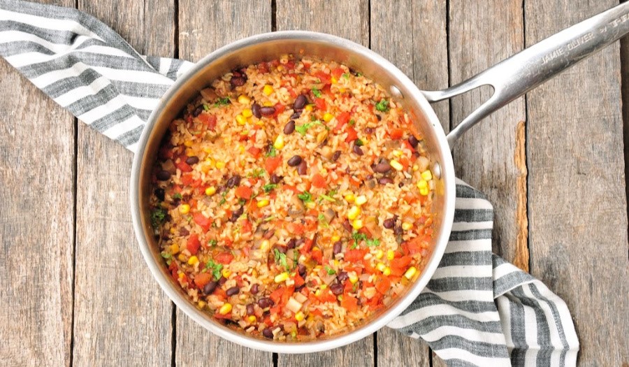 In a small bowl measure out all dried spices (basil through oregano). Set aside. To a saucepan over medium heat, add oil or water. Once heated, add onions and peppers and sauté until onion is translucent, about 3-4 minutes, stirring frequently. Add corn, drained beans, and jalapeno, if using. Stir to cook, about 3 minutes. Add a teaspoon or two additional water or oil if pan is getting dry. Add dried spices and stir constantly, allowing to bloom in the hot pan, about 1 minute. Stir in Rotel tomatoes until incorporated. Stir in bouillon and rice, stirring a few seconds until all rice kernels are coated. Add water and stir until incorporated. Turn heat to high and allow to come to a light boil. Turn heat down to low, cover saucepan and cook 20-40 minutes, following time required for the type of rice you are using. (typically 20 minutes for white and 40 minutes for brown). Uncover and stir in cilantro, if using. Serve. We’ve served this plain, with tortilla chips, with tortilla shells, and over greens.
