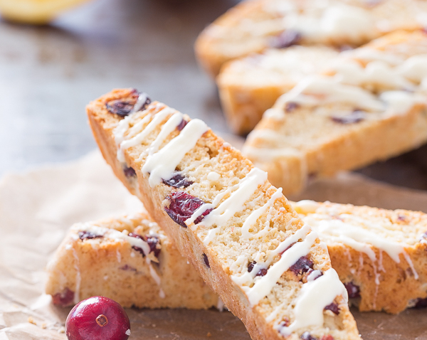 Orange Cranberry Biscotti is a toasted crunchy treat that goes well with your morning beverage or as a snack. This orange sweet dough is baked with sweet dried cranberries and drizzled with white chocolate. Makes a great holiday gift too! I love biscotti – they are crunchy and are great with coffee, tea or hot chocolate. Orange and cranberries go perfect together and note the drizzle of white chocolate (because everything is better with it!). Keep biscotti on hand for your own enjoyment or invite a friend over to sit and relax during these busy times.