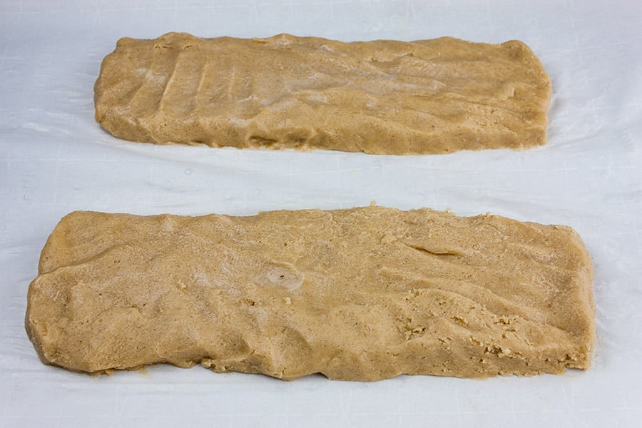 Add the flour a little at a time until blended. Divide the dough in half. Place each piece on a parchment lined baking sheet and shape each into a log about 10″-12″ long and 4″ wide. Damp fingertips will help with this process.