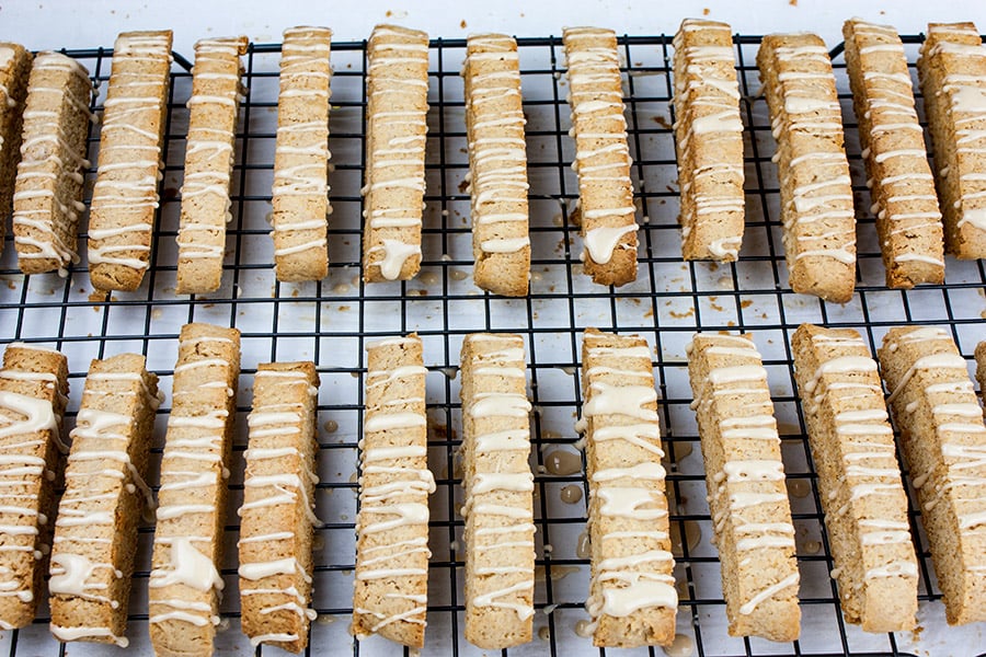 Remove from the oven, turn the slices over and bake for another 10 minutes or until mostly firm. They will continue to harden while cooling.