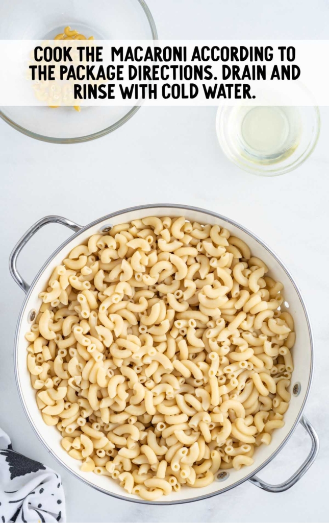 Cook the elbow macaroni according to the package directions. Drain the hot water off and rinse with cold water to stop the noodles from cooking. Be sure to drain very well.