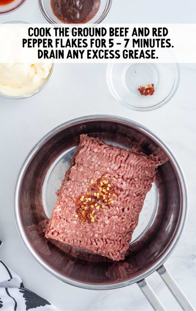 Add the ground beef and red pepper flakes to a 3 to 4-quart saucepan over medium-high heat for 5 to 7 minutes, stirring often. Drain any excess grease.