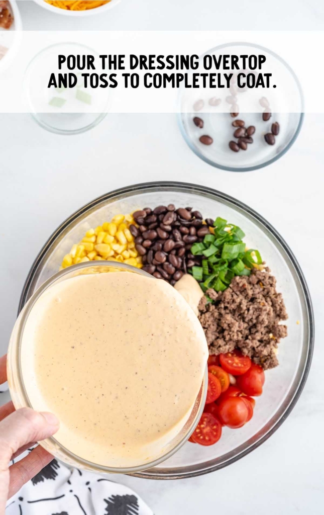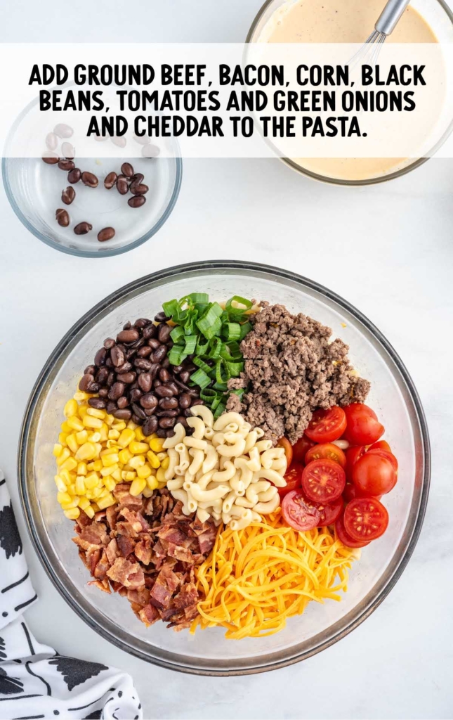 Add the cooked ground beef, crumbled bacon, corn, black beans, tomatoes, sliced green onions, and shredded cheddar.