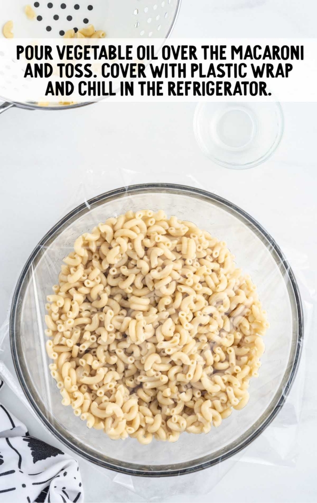 Once drained, add the pasta to an extra-large mixing bowl. Pour the 2 tablespoons of vegetable oil over the macaroni and toss. Cover with plastic wrap and chill in the refrigerator.