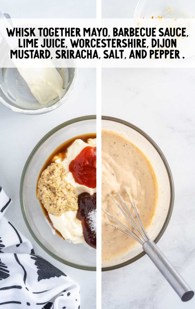 Add the mayo, barbecue sauce, lime juice, Worcestershire sauce, Dijon mustard, sriracha sauce, kosher salt, and fresh cracked black pepper to a small mixing bowl. Whisk to combine thoroughly. Set it aside.