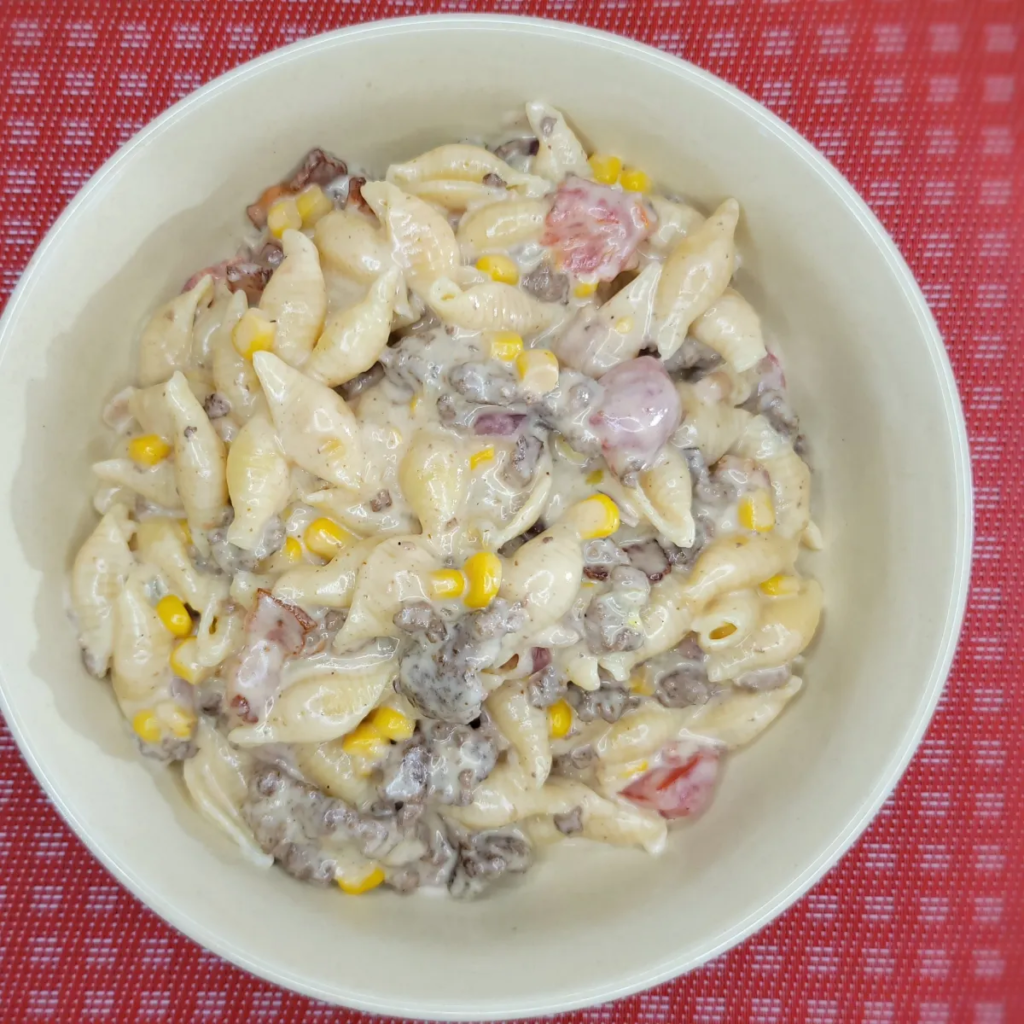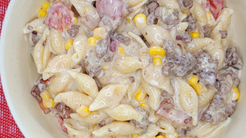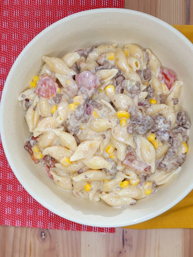 Sometimes I just ask my hubs to pick one ingredient to inspire me for dinner ideas. This was one of those times. I had already settled on a pasta dish but I couldn’t decide which direction to go other than that I didn’t want red sauce. So I asked and he delivered Ground Beef. The gears started turning and Cowboy Pasta was the tasty tasty result. A homemade Mac & Cheese loaded up with beef, bacon, jalapenos, tomatoes and corn!