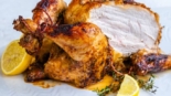 Heat large pan on medium-high heat. Melt half the butter (2 tablespoons). Add the chicken and cook for 5 minutes on each side or until the chicken is browned. Remove chicken from pan, cover and keep warm.