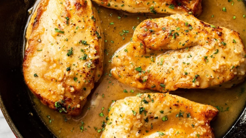 Add 1 tbsp of the butter and the olive oil to a skillet over medium-high heat. Once the pan’s hot, add the chicken. Cook it for 4-5 minutes/side until golden, then transfer to a plate.