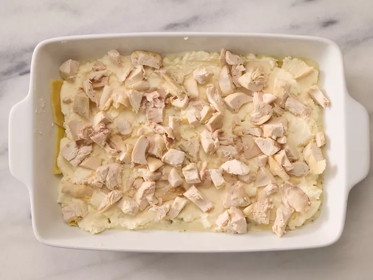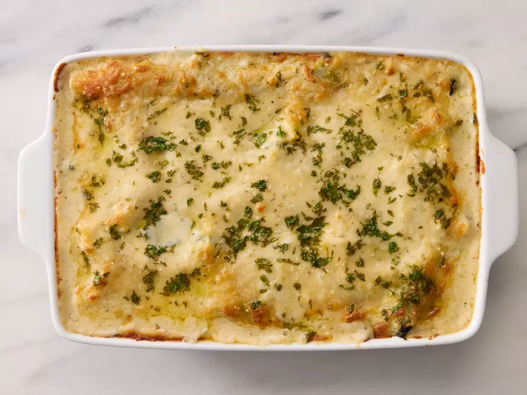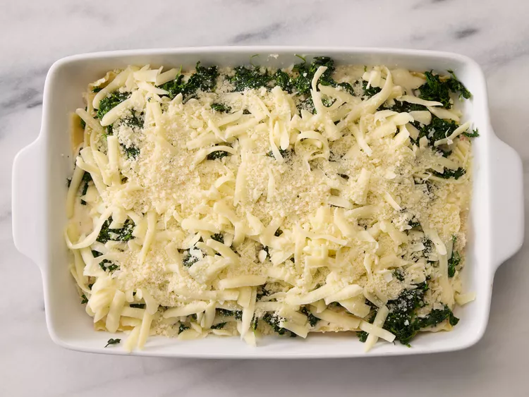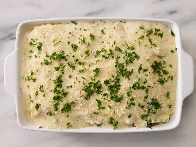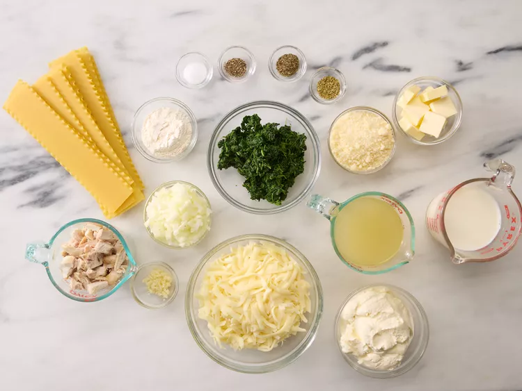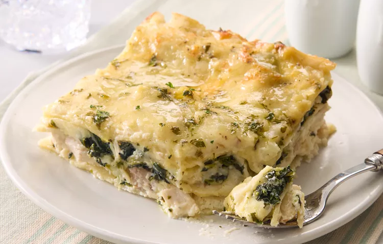 Gather all ingredients and preheat the oven to 350F (175C). Bring a large pot of lightly salted water to a boil. Add lasagna noodles and cook for 8 to 10 minutes or until al dente; drain and rinse with cold water. Meanwhile, melt butter in a large saucepan over medium heat; stir in onion and garlic. Whisk in flour until lightly browned and onion is tender, about 2 minutes. Add chicken broth, milk, and salt; cook, whisking continuously, for 1 minute. Stir in 2 cups mozzarella and ¼ cup Parmesan until well combined. Season with basil, oregano, and black pepper; remove from heat and set aside. Spread ⅓ of the sauce mixture in the bottom of a 9×13-inch baking dish. Layer with 3 lasagna noodles, ricotta, and chicken. Arrange 3 lasagna noodles over the chicken and layer with ⅓ of the sauce mixture, spinach, remaining 2 cups mozzarella, and ½ cup Parmesan. Arrange remaining noodles over cheese and spread remaining sauce evenly over noodles. Sprinkle with parsley and remaining ¼ cup Parmesan. Bake in the preheated oven for 35 to 40 minutes. Serve and enjoy!
