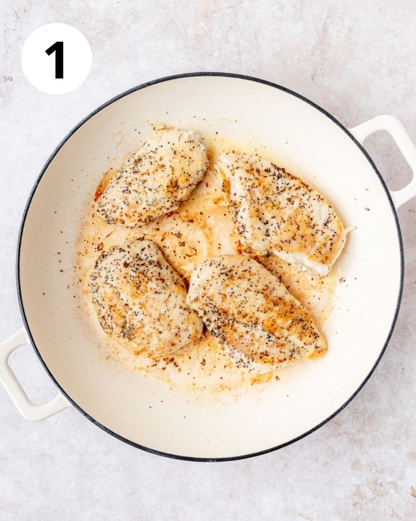 In a large skillet or cast iron, heat the olive oil over medium-high heat. Sear the chicken breasts for 1-2 minutes on each side. Then remove and set aside.