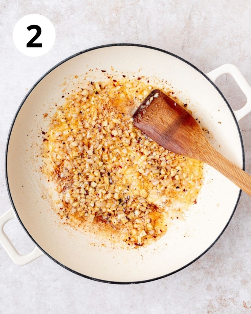 Add in the butter, shallot, garlic, and red pepper flakes and cook for about 5 minutes, until soft and aromatic.