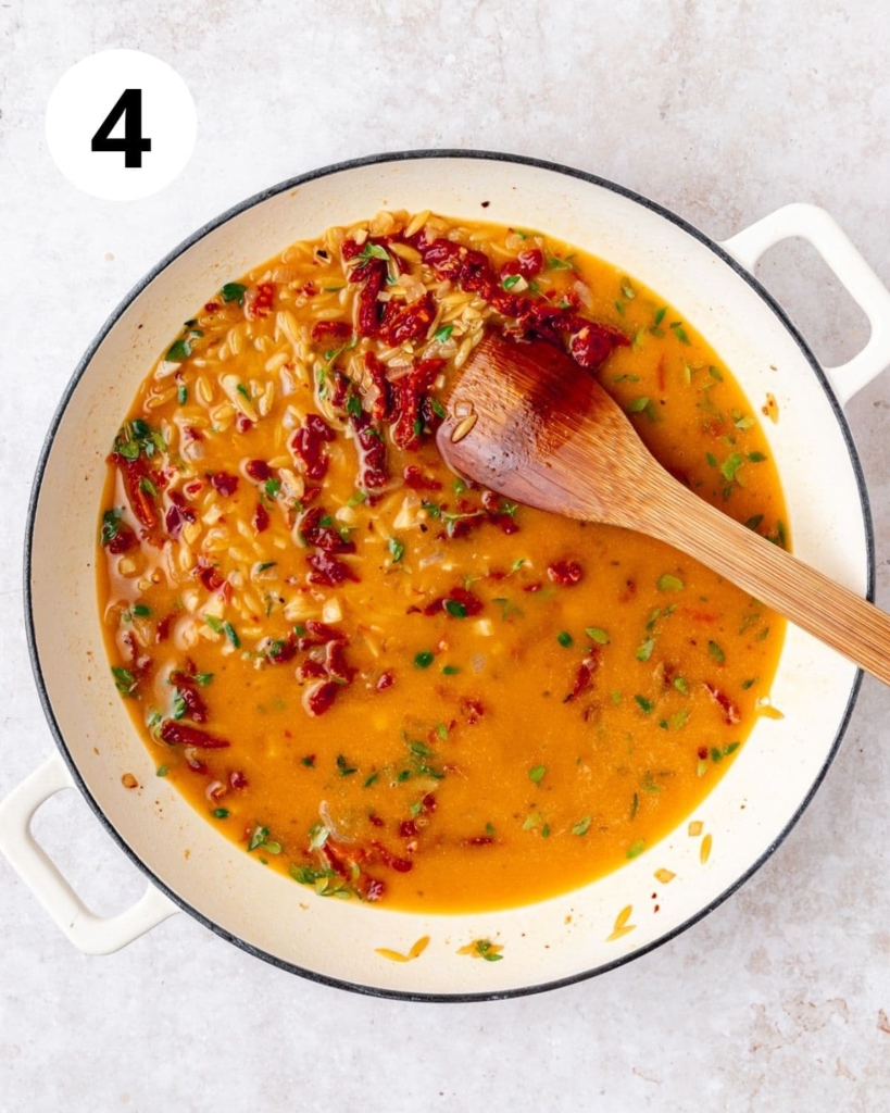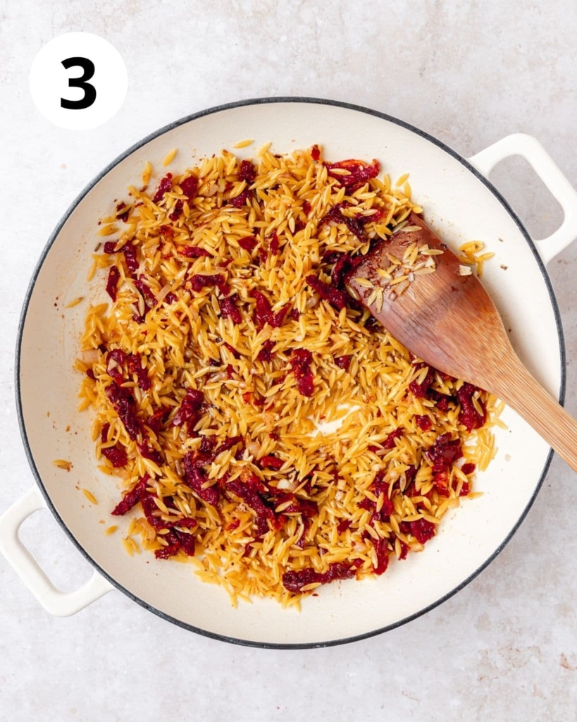 Then add in the sun-dried tomatoes and dry orzo and toast for 1-2 minutes, stirring frequently.