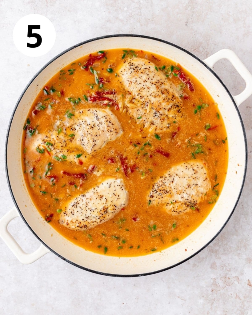 Place the chicken breasts back in the pan. Then cover and let simmer for 10-15 minutes (stirring occasionally so that the orzo doesn’t stick to the bottom of the pan) until both the orzo and chicken are fully cooked and most of the liquid is absorbed.