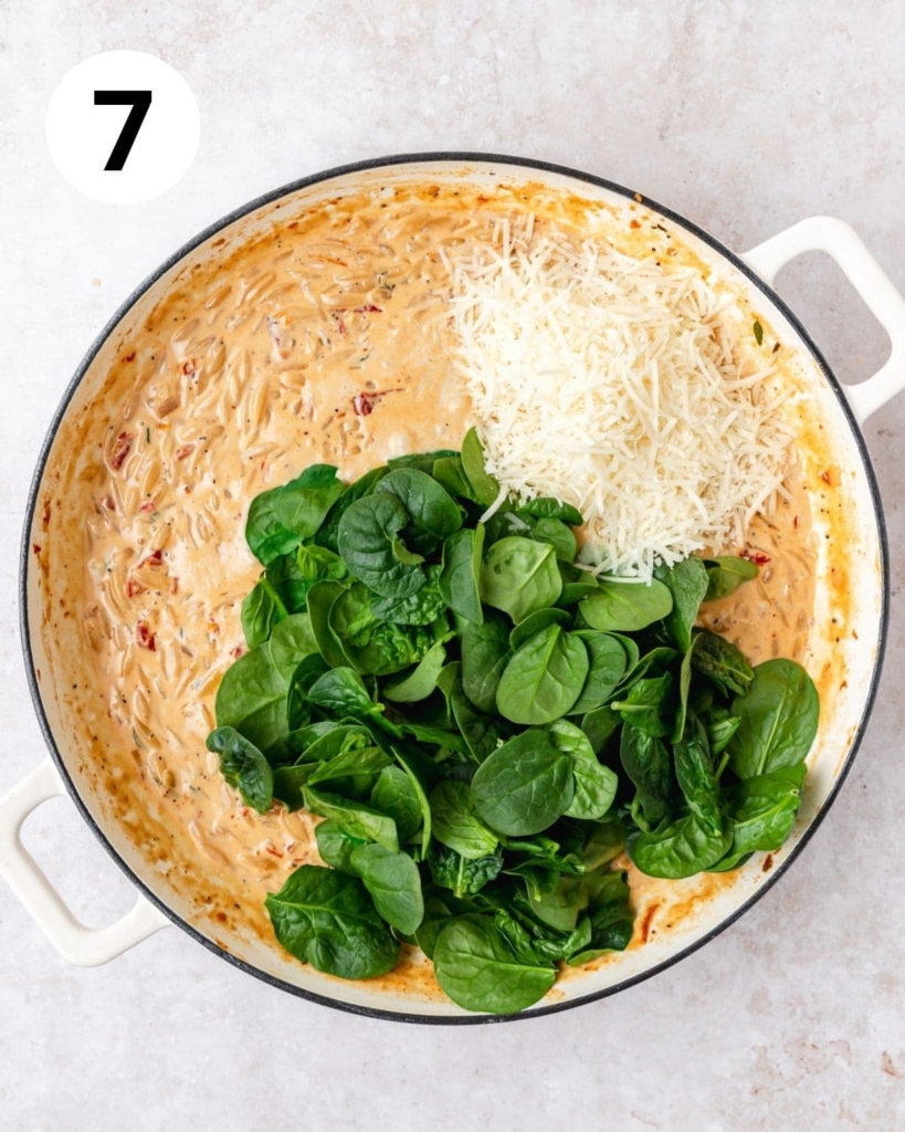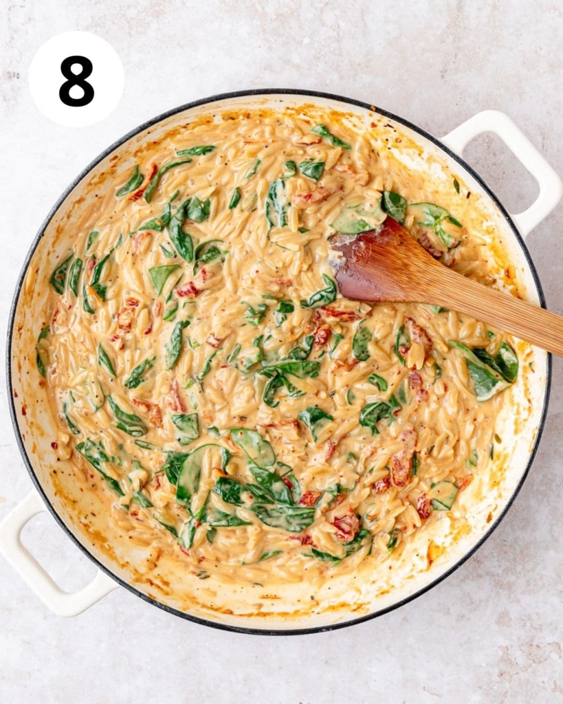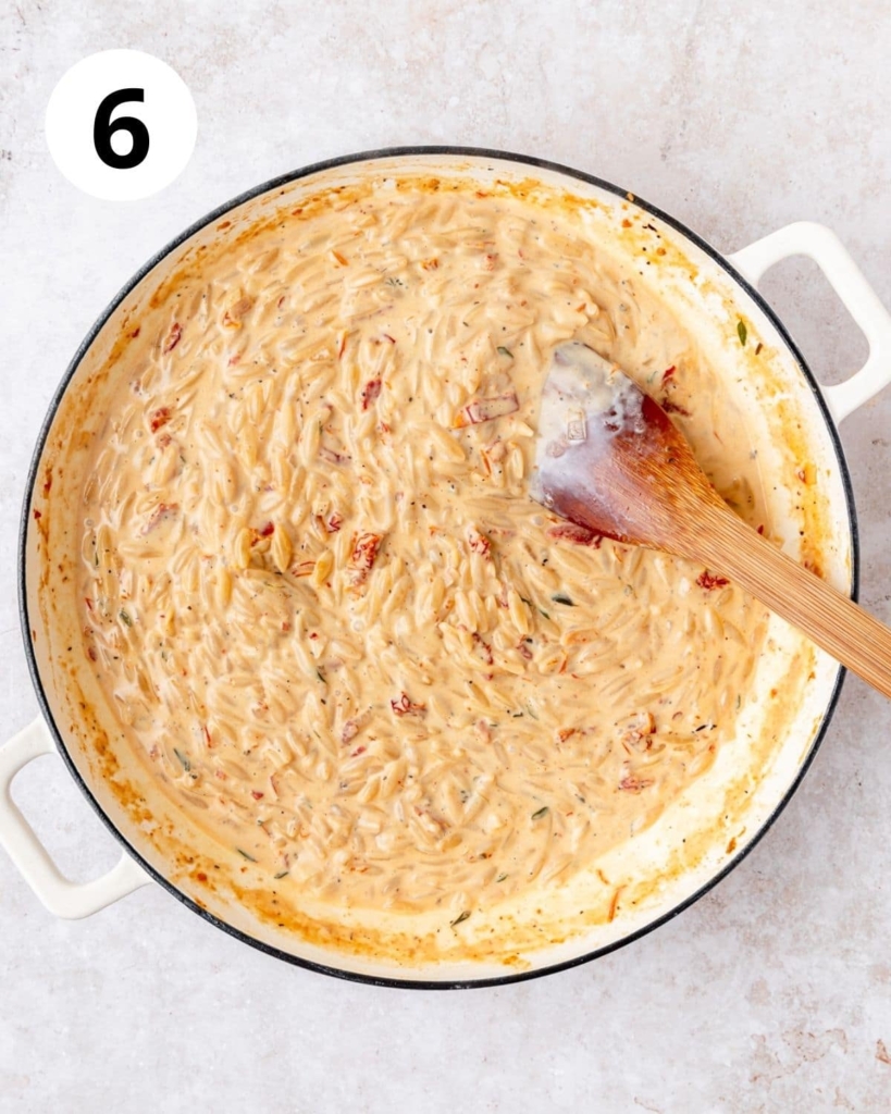 The orzo will soak up the sauce in the fridge, so it’s best to reheat on the stove with a little extra broth or cream to add more moisture.