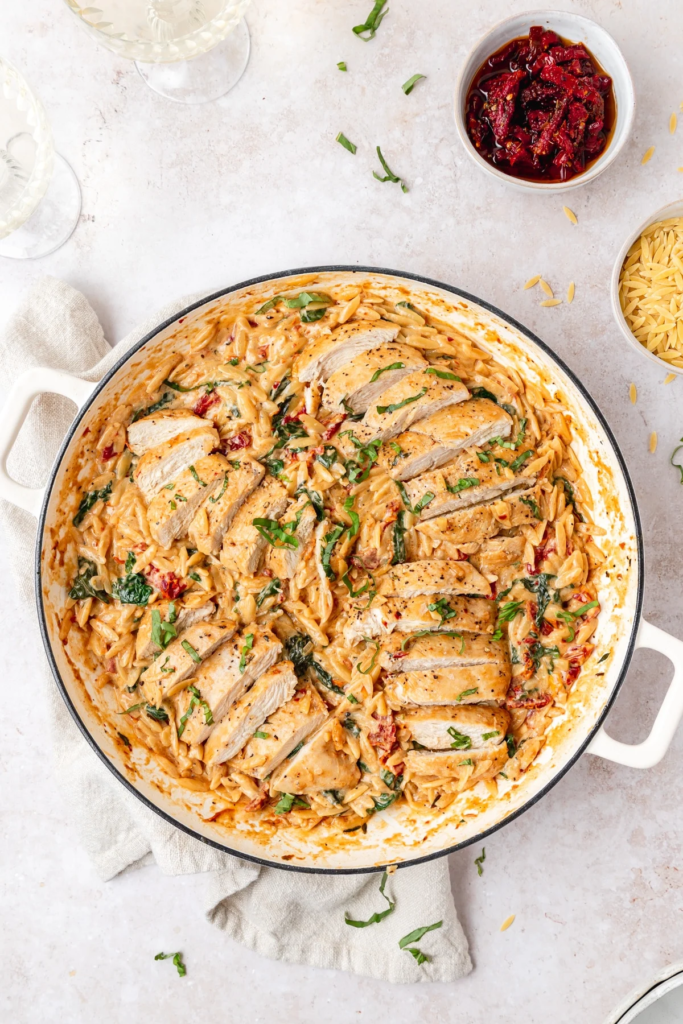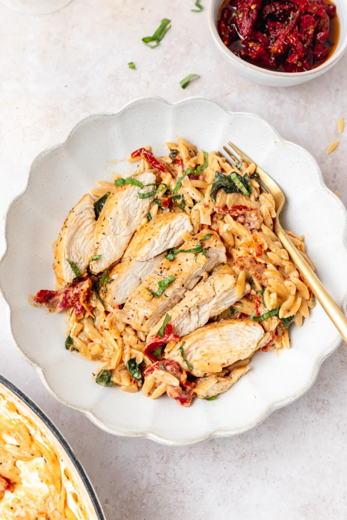 This one-pan creamy Tuscan chicken orzo is an easy and filling weeknight dinner that comes together in about 30 minutes! With pan-seared chicken breasts, orzo pasta, sun-dried tomatoes, spinach, and fresh basil in a creamy sauce, it’ll be your new favorite Italian-inspired meal!