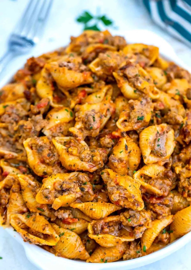 Classic Beef and Shells is a delicious and hearty pasta dish similar to the hamburger helper, but creamier and way more flavorful. It is ready in just 30 minutes, making it perfect for a quick dinner for the whole family! Rich, flavorful, and cheesy, even kids will love it! With this recipe, you can have all of this finished and on the table in about 30 minutes! I didn’t use any special tools or expensive ingredients to make it. It is great for a busy weeknight when you want something quick, but very delicious, that feeds at least four people. I made sure that the flavors and textures in this easy meal are to die for, no wonder its one of the most popular recipes on the blog. The shells are perfectly cooked so you can bite into them, and they hold onto a good amount of sauce, ground beef, and flavor. Make sure you try it too!
