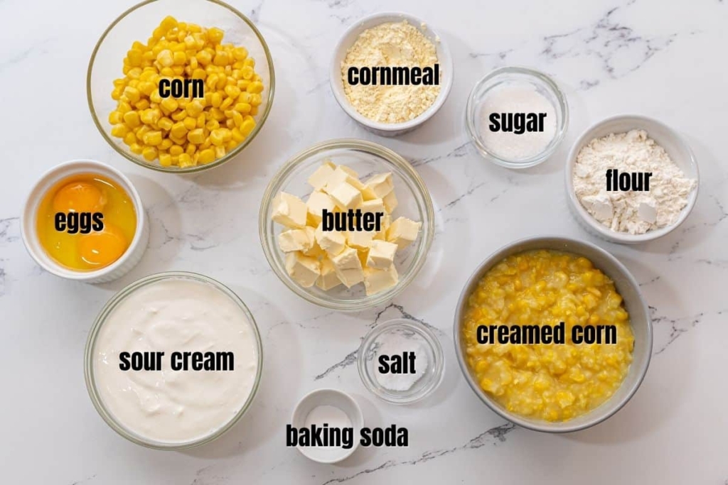 Preheat the oven to 350℉. Grease a 2-quart, 8×8-inch, or 11×7-inch baking dish with butter and set aside. In a microwave-safe dish or small quart-pan, melt 1 stick of butter. Allow the butter to cool while combining the other ingredients. In a medium mixing bowl, mix together ½ cup flour, ½ cup cornmeal, ¾ teaspoon salt, ½ teaspoon baking soda, and 2 tablespoons sugar. In a large mixing bowl, combine the melted butter, 2 eggs, 1 cup sour cream, 15-ounce can of creamed corn, and 15-ounce can of corn kernels that have been drained. Add the flour mixture to the wet ingredients and gently fold together until everything is JUST combined. Don’t overmix. Pour the mixture into the prepared baking dish and bake for 45-50 minutes, or until the center is fully set and the casserole is lightly browned.