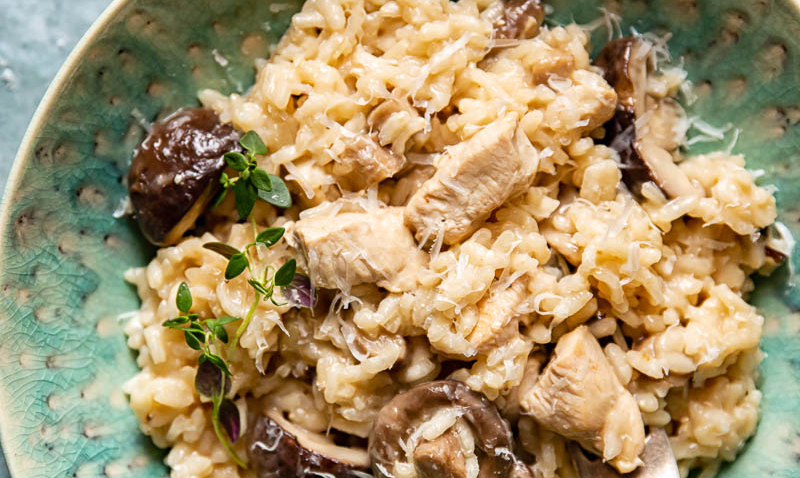 This chicken risotto recipe is a quick and easy comfort food dinner that the whole family can enjoy. Add the mushrooms if you are a fan or leave them out. Either way this risotto will leave you feeling satisfied but won’t weigh you down. I’m ashamed to admit that there was a time in my life when I thought that all rice dishes taste the same, by which I mean bland. It took a year living in the Philippines to show me the incredible variety of flavorful dishes that could be made out of rice. The recipe for chicken risotto I am sharing today is far from Asian style of eating rice. But what they have in common is using rice as the star of the show. The magic of risotto rice is the creaminess it brings to a dish. Luxurious, decadent creaminess that I just can’t get enough of. To make a good thing even better, we’ve added savory chicken, nutty mushrooms and salty Parmesan cheese. Intrigued? I hope so, because you are going to love this one! This risotto is not a side dish. Not an afterthought. It is truly a main course, delicious and satisfying in every way.