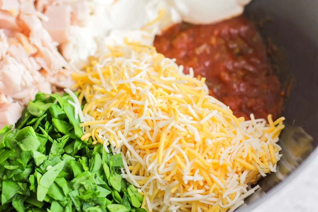 Meanwhile, in a large bowl mix 3 cups chicken, 6 ounces cream cheese, 1½ cups spinach, 1½ cups Colby Jack cheese, ½ cup salsa, and ⅓ cup sour cream. Add salt and pepper.