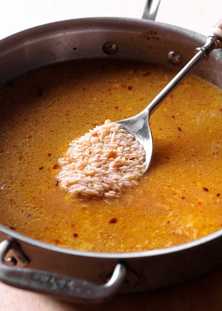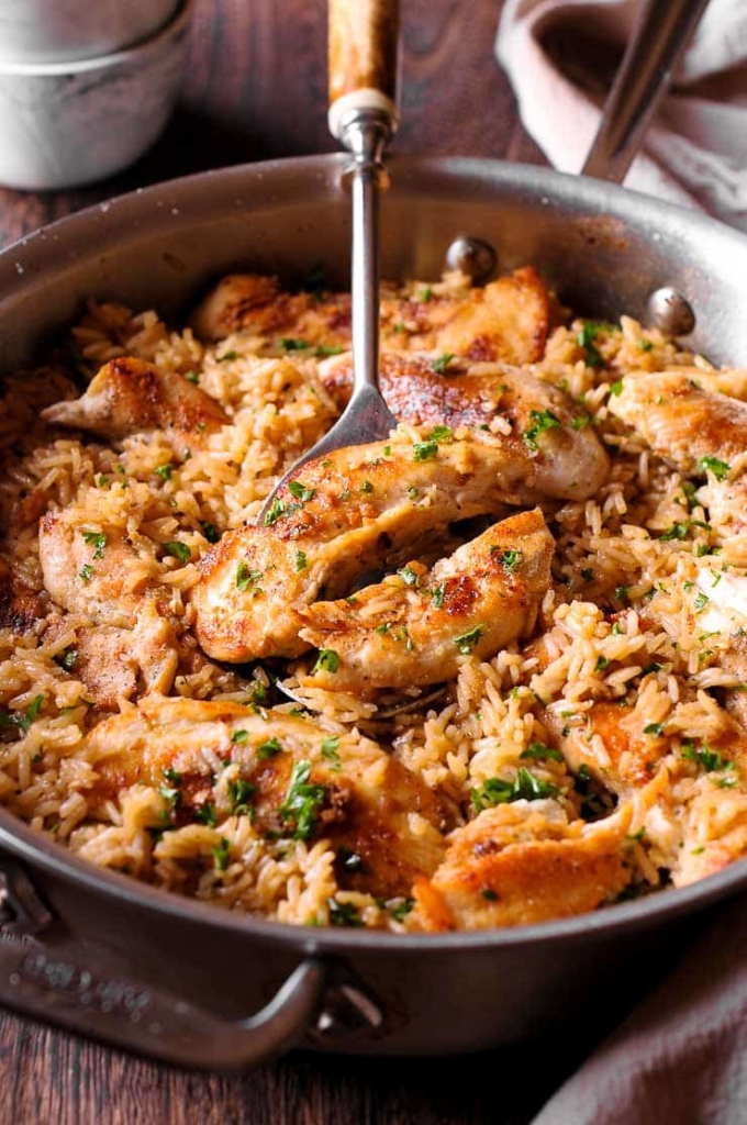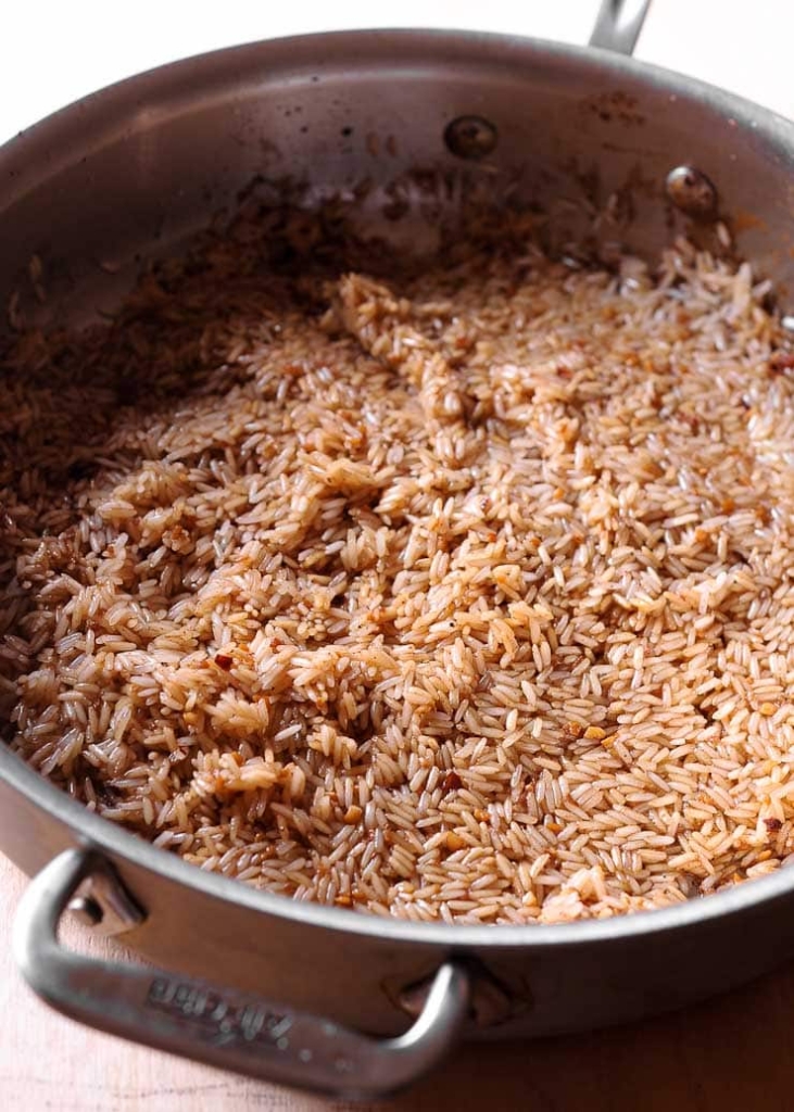 Add uncooked rice to skillet with remaining butter sauce. Stir well – make sure it’s completely covered. Add chicken broth and remaining ½ teaspoon of salt. Bring mixture to a low boil then reduce heat to medium-low, cover pan and simmer for 20 minutes or until rice is tender. Stir several times while it’s cooking