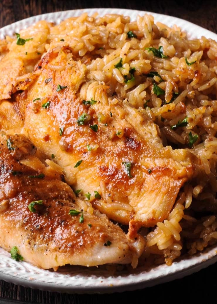 Chicken with Garlic Parmesan Rice is the perfect dish for easy weeknight dinners. This quick chicken and rice recipe is not only tasty but it uses ingredients you likely have on hand. Simply use chicken tenders, white rice and white wine to quickly whip up this easy dinner!
