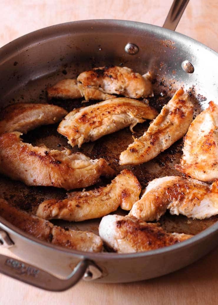 Heat olive oil over medium heat in a large skillet. Season chicken with salt and pepper and garlic powder. Sauté chicken tenders until nicely browned and just cooked through. Remove from skillet and set aside.