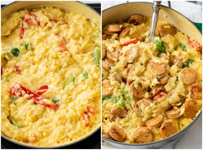– Consider using sliced precooked chicken sausage which will only requires about 3 minutes of searing time, but you can use any kind of sausage that you want.