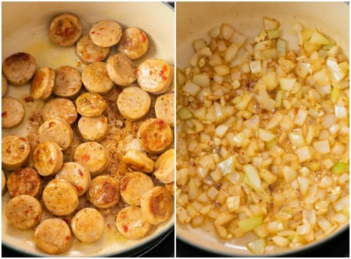 Heat 2 tablespoons olive oil to a large pot over medium heat. Slice the sausage into ½-inch thick slices and cook according to package instructions. Remove from the pot and set aside.