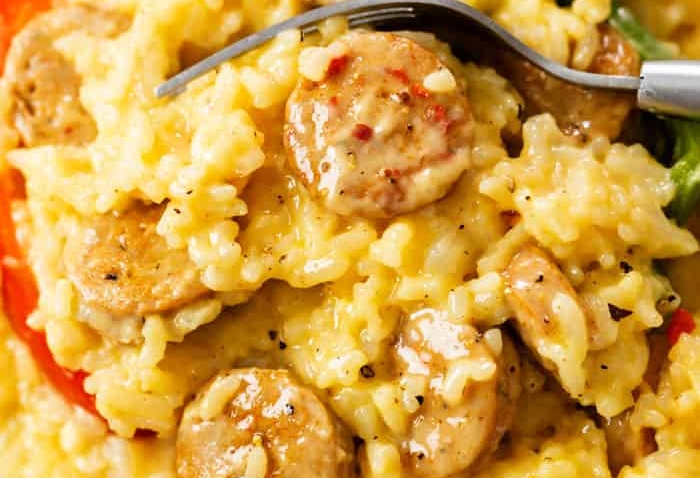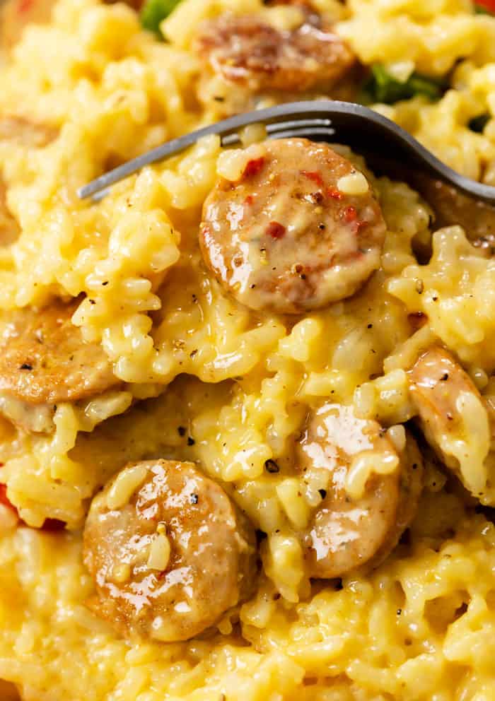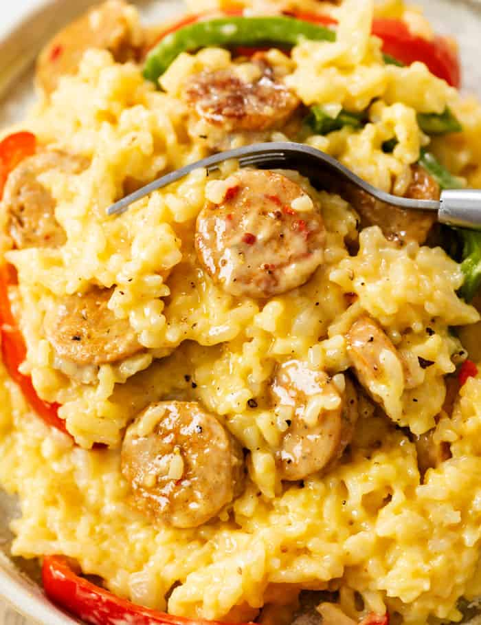 This Sausage and Rice Recipe is easy to make in just one pot with juicy bell peppers and creamy, cheesy rice. It also makes a great freezer meal! I have a weakness for creamy, cheesy rice, and nothing beats the flavors in this sausage. I happened to use chicken Sausage with Roasted Peppers and Asiago, but you can use any kind that you want, even ground sausage will work! I love making casserole-style recipes like this, especially because it makes great freezer food for a quick lunch during the week. Let’s get into everything you need to know so that you can get this one the table ASAP. Your family will love it.