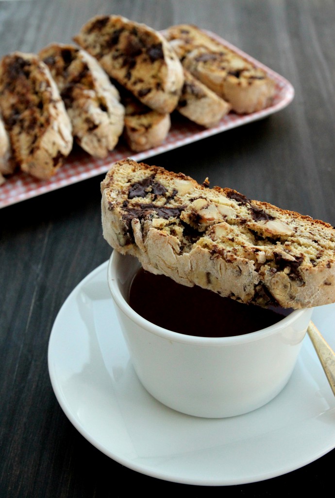 Blanch the almonds, if necessary (this will take a while). Chop chocolate into small pieces. Pre-heat oven to 180C. In a dry skillet, toast almond over low heat until they start to brown and turn fragrant. Allow toasted almonds to cool and then chop coarsely. Line a baking sheet with parchment paper. Beat eggs and sugar on high speed until thick, pale and fluffy. Add vanilla extract and beat some more. Whisk flour, baking powder and salt in a separate bowl. Add flour mixture to egg mixture and beat until combined. Fold in the chopped almonds and chocolate pieces until evenly distributed. Transfer the biscotti dough onto a well-floured, cool, flat surface, and shape it into a log. Make sure to flour your hands well before shaping as the dough can be quite sticky. Transfer the log of dough onto the parchment paper-lined baking sheet, and then flatten it out a little more to look like a rectangle (for as much as your baking sheet will allow). Bake for 25 minutes or until firm to the touch, then remove from oven and allow to cool for 10 minutes. Meanwhile, reduce temperature to 165C. Transfer the log to a cutting board and slice into pieces (with thickness of about one large finger). Place biscotti cut side down, on the baking sheet, and bake for another 8 to 10 minutes, then flip slices over to the other side, and bake for another 8 to 10 minutes until golden brown and crunchy. Remove from oven and cool before serving with freshly-brewed tea or coffee.