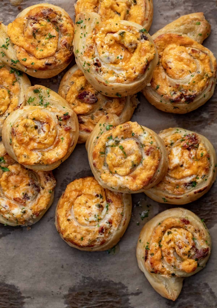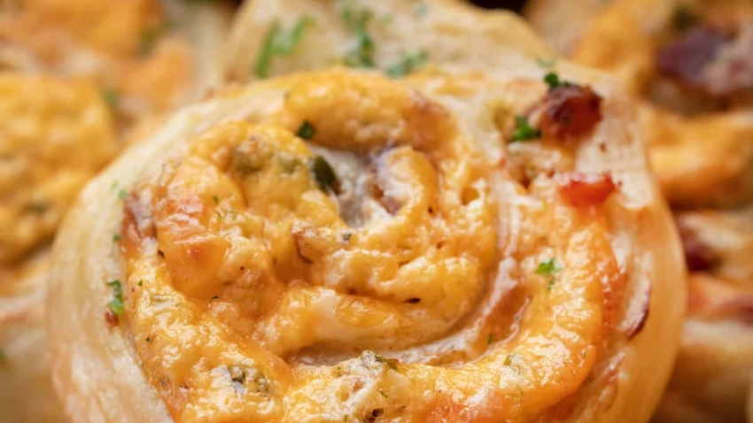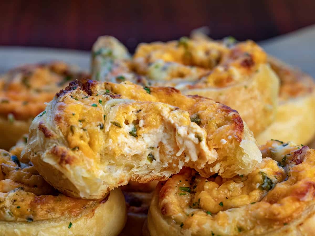 Preheat oven to 400°F and line a large baking sheet with parchment paper. In a medium bowl mix together cream cheese, ranch seasoning, cheddar cheese, jalapenos, and bacon. Set aside while you prepare the puff pastry. On a lightly floured work surface, roll the puff pastry dough out into a 9×12 inch rectangle. Spread the cream cheese mixture over the dough, leaving about a ½ inch of empty space on the long edge. Wet the empty edge of the dough with water (or a beaten egg). This will help the dough stay together when rolled. Roll the dough into a tight log, starting on the opposite long edge. Press gently along the edge to hold it together. Using a sharp knife, carefully slice the log into 12 equal sized pieces. Bake for 18-20 minutes, or until the dough is golden brown.