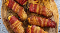 While the bacon is cooking, mix together the cream cheese, shredded cheese, garlic powder, onion powder, salt, and pepper in a small bowl. Set aside.