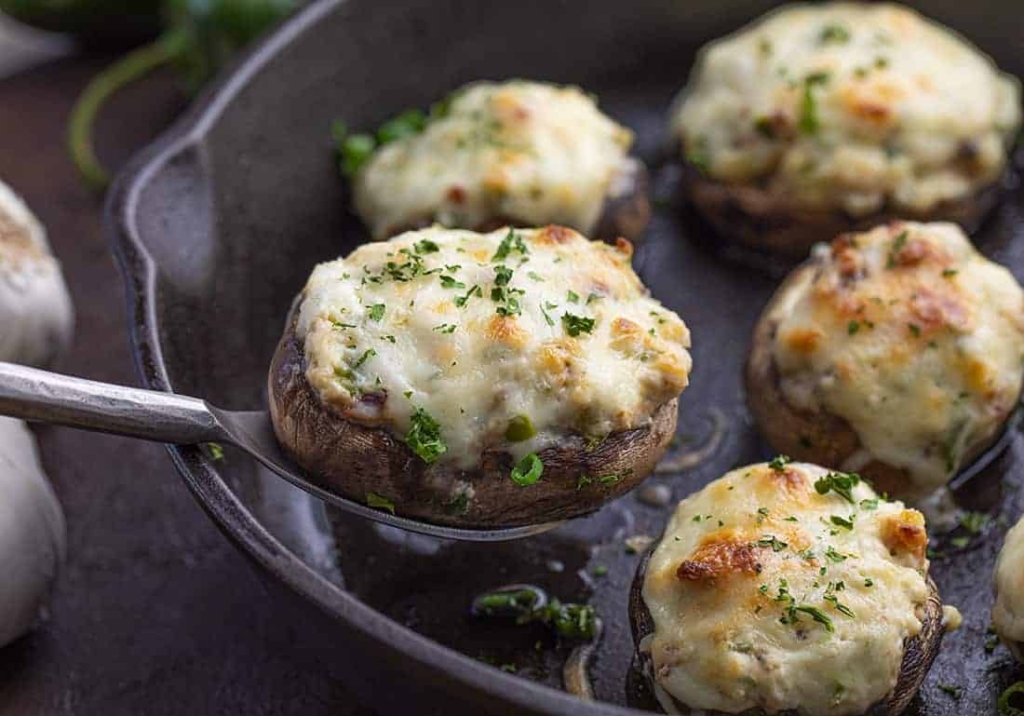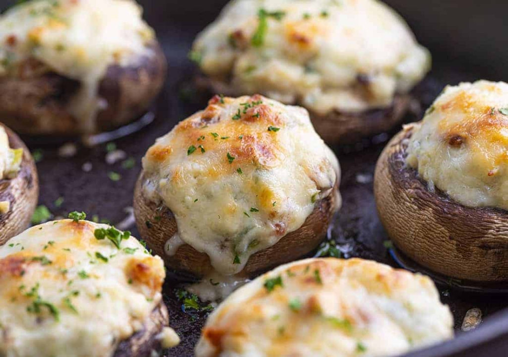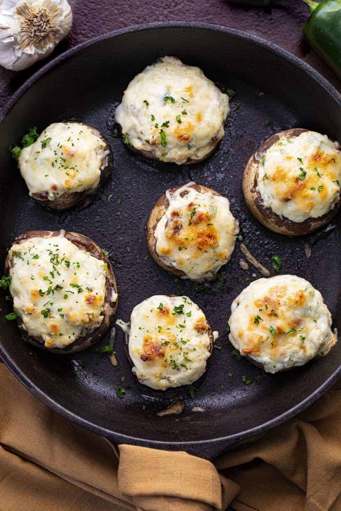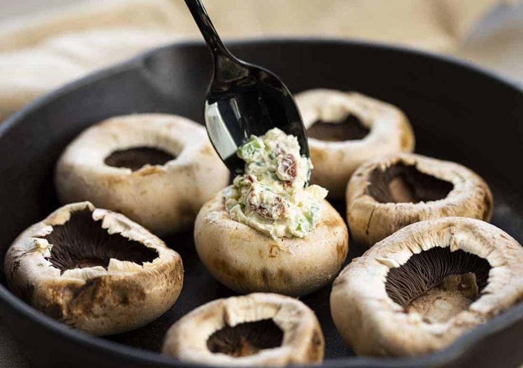Fill each mushroom cap with a generous amount (about 1 tablespoon) of the cream cheese mixture. Arrange the stuffed mushrooms in a 12-inch cast-iron or oven-safe skillet.