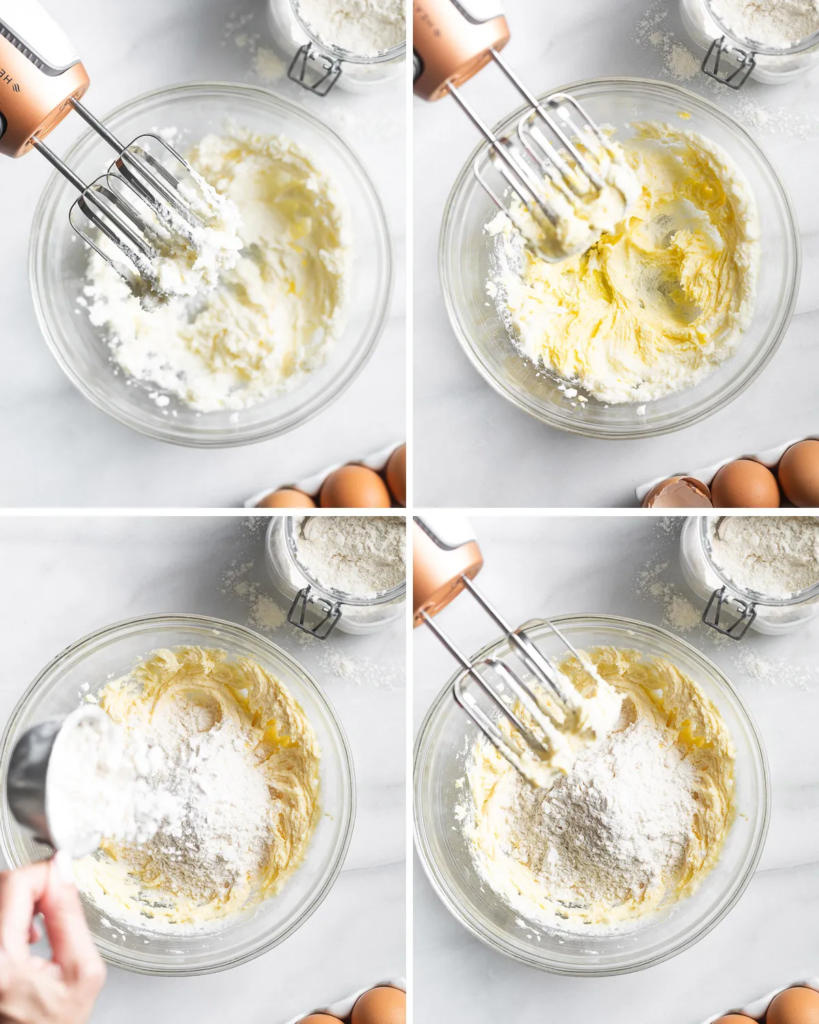 In the bowl of a stand mixer fitted with the paddle attachment, cream together the butter and sugar on medium speed until light and fluffy, about 2 to 3 minutes. Scrape down the sides of the bowl.