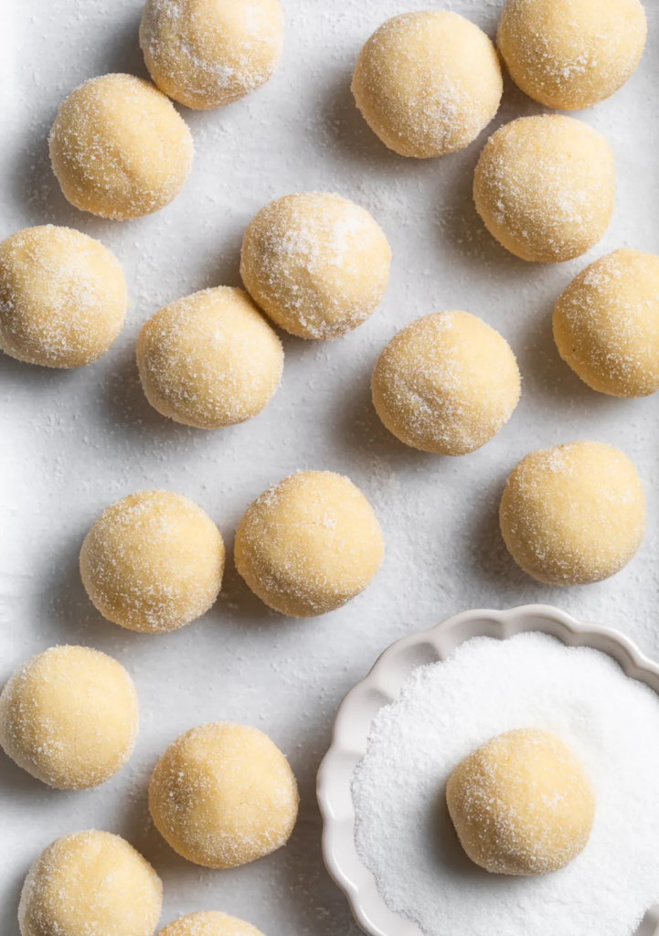 Scoop 2-ounce (3 tablespoons) portions of the cookie dough and use your hands to roll the dough into balls. Roll the dough in a small bowl filled with the 1/4 cup granulated sugar and coat all sides.